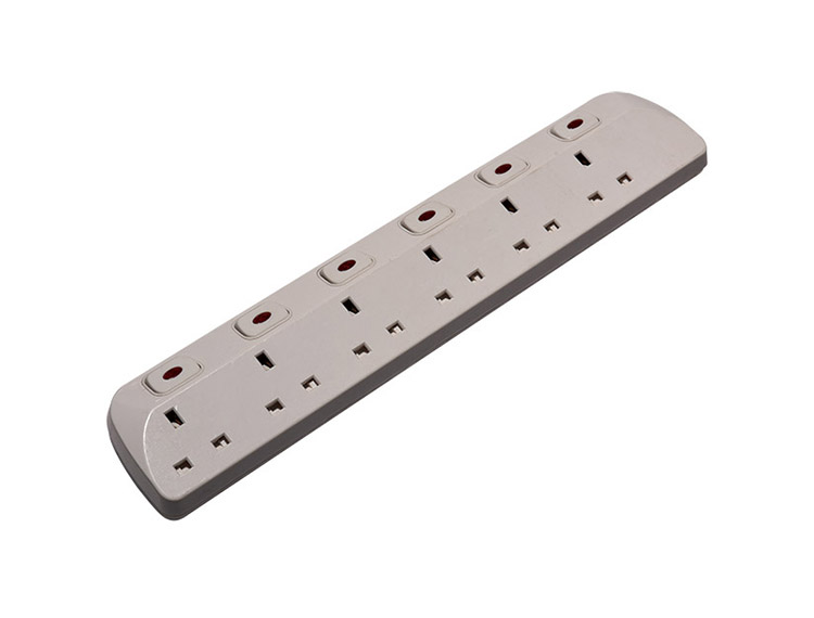 型號:UK2506SL 名稱:英式排插 規格:六位英式排插 功率:13A 250V~ 3250W 面板材料:ABS/PC 五金材料:純銅 包裝:20個/箱